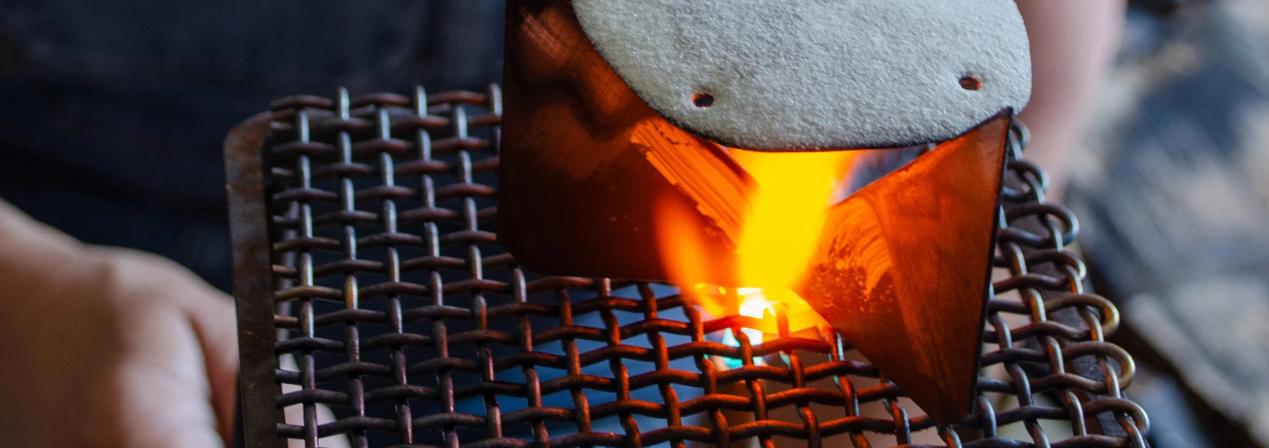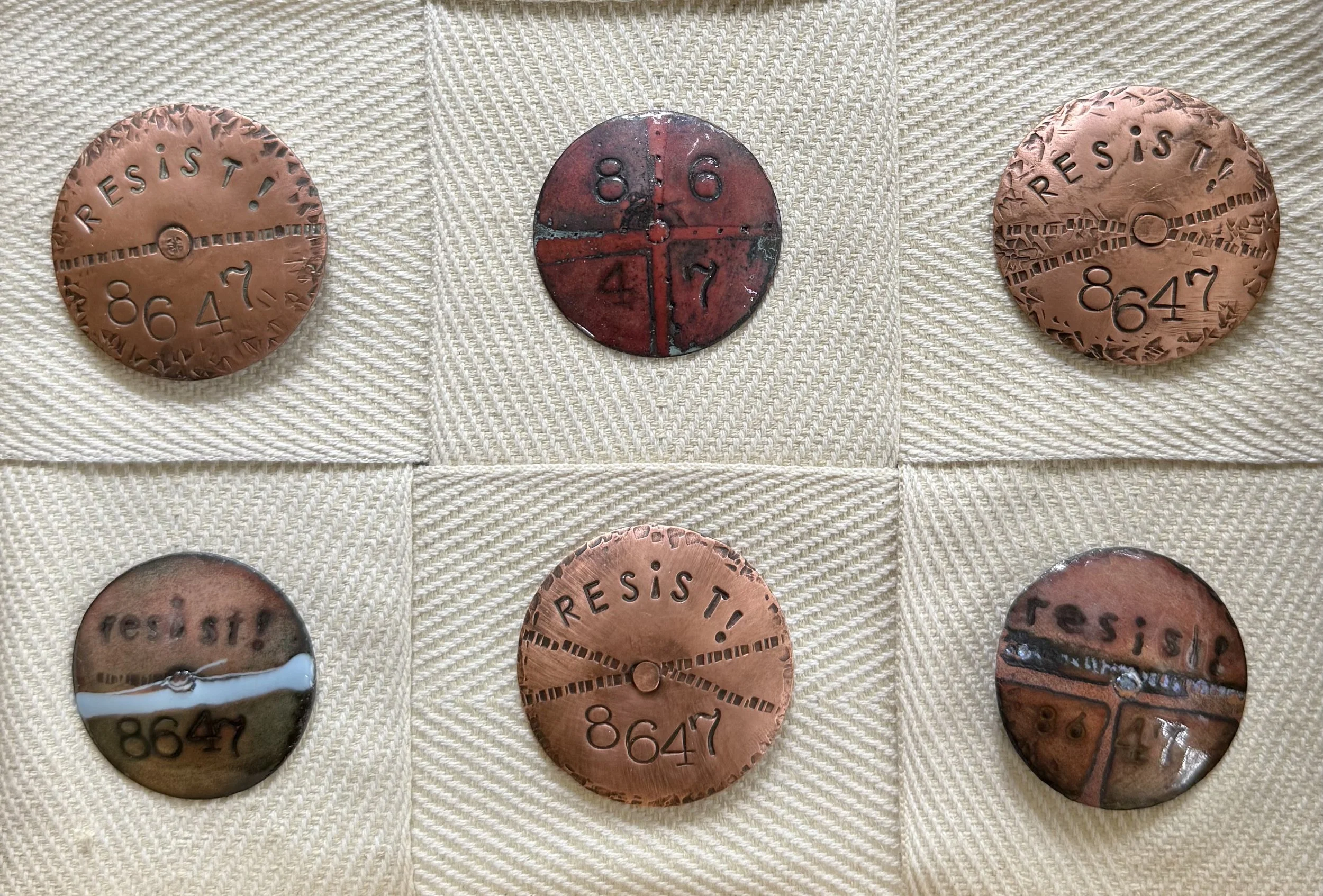 hand-hammered copper discs. glass enameling powder. torch and kiln firing.